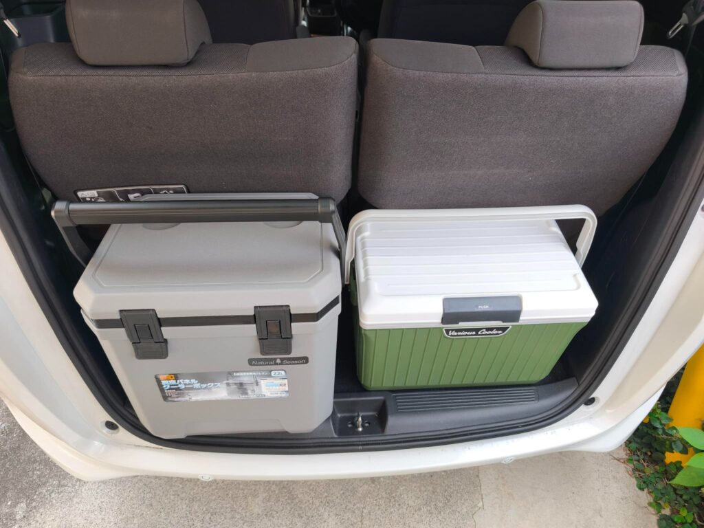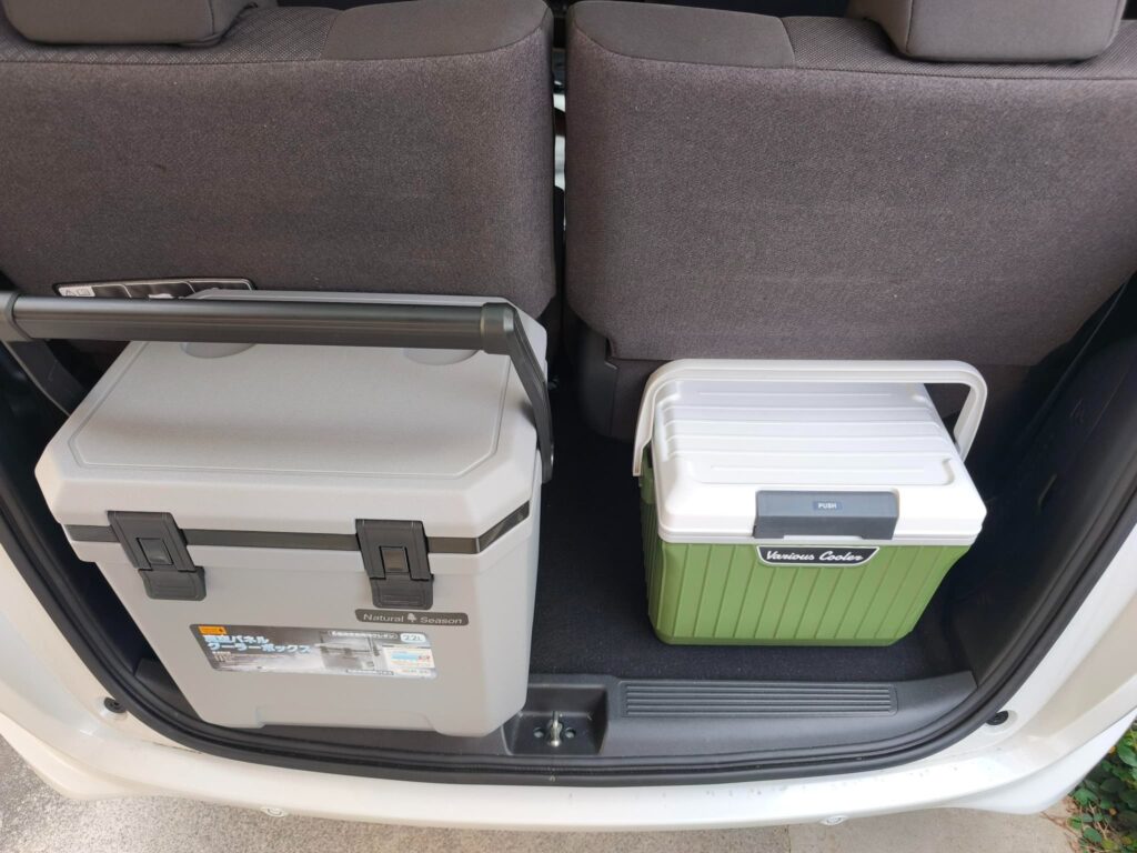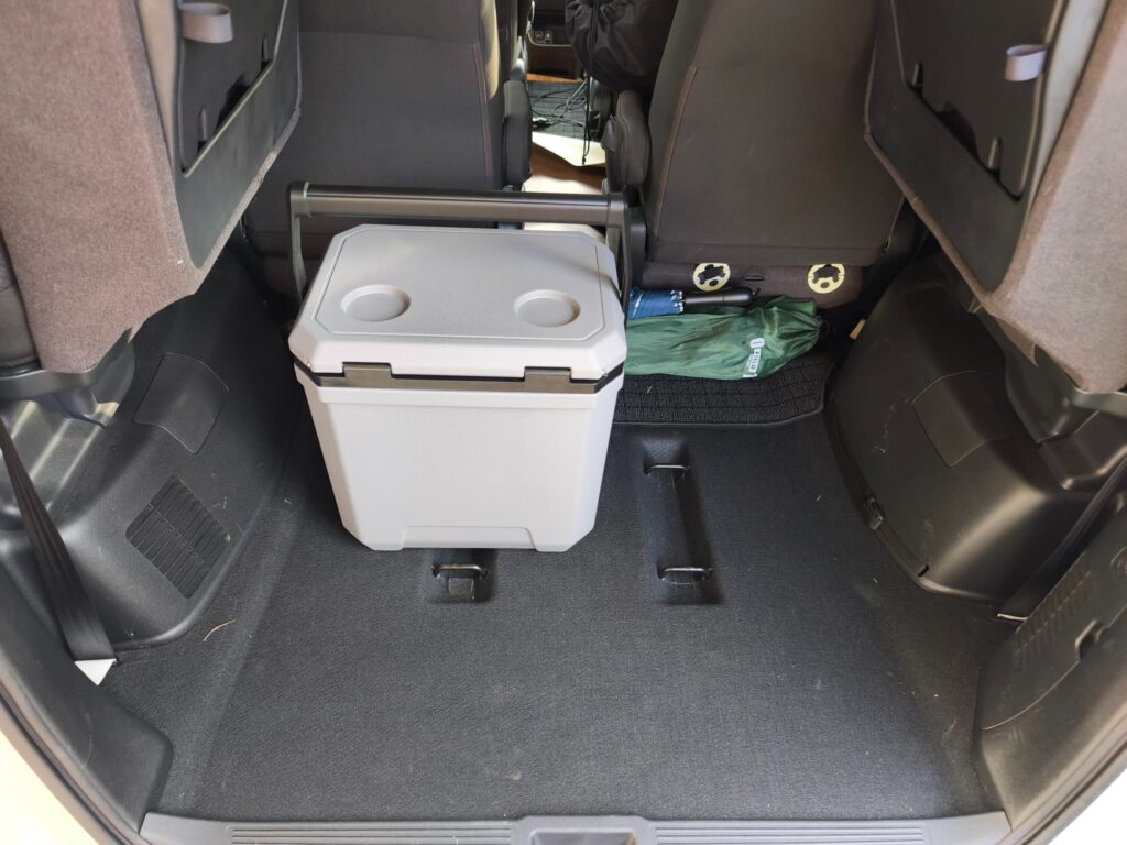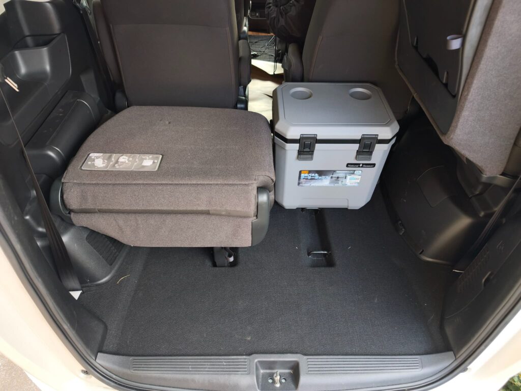 ↓3列目の座席を作るとドアを閉めることはできません。隣の17Lのクーラーボックスは何とか閉まります。